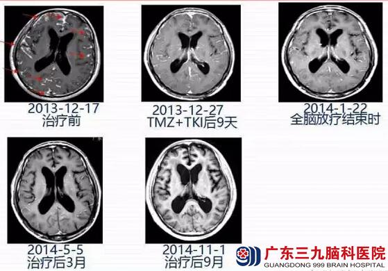 患者治疗后情况明显好转,于后9个月回院复查,KPS=90分,治疗后13月随访患者仍存活。