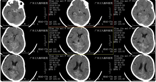 入院情况:患者2天前无明显诱因突发剧烈头痛伴有间断恶心呕吐,急诊当地医院,行头颅CT:蛛网膜下腔出血。给予止血、脱水、补液等药物后病情好转。为进一步治疗到广东三九脑科医院。