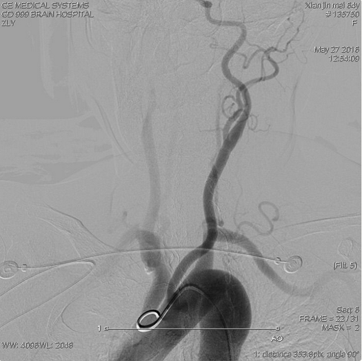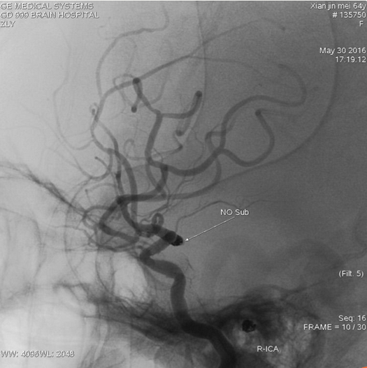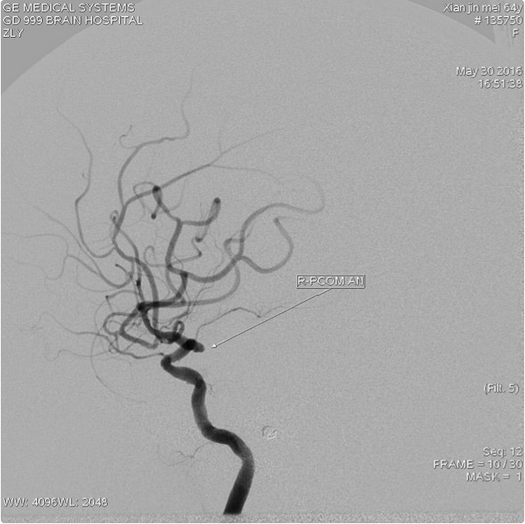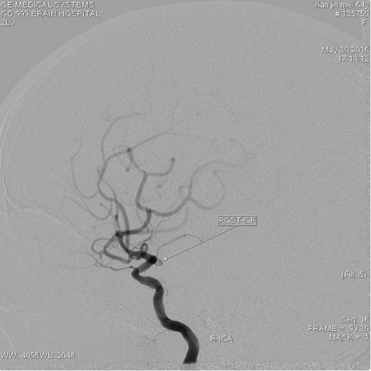 诊疗经过:完善相关检查,于5月30日全麻下行右侧后交通动脉瘤+右侧小脑后下动脉瘤栓塞术,术后给予抗炎、抗凝、营养神经、改善微循环、维持水电解质平衡等对症处理。经治疗后于6月16日康复出院。
