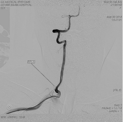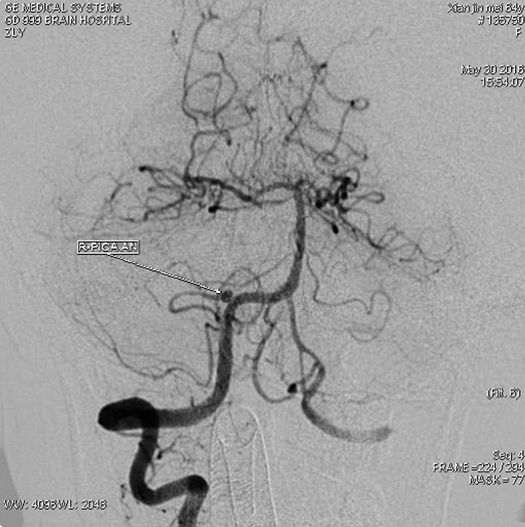 右椎动脉造影:右侧小脑后下动脉瘤,大小约2.7×3.0mm;瘤颈口与右侧小脑后下动脉开口关系密切