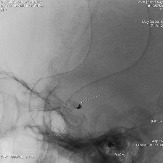 右侧颈内动脉造影:右侧后交通动脉瘤,大小约2.0×2.5mm;