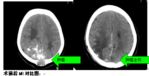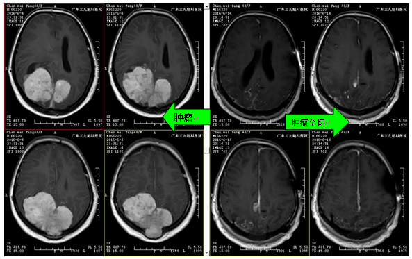 广东三九脑科医院神经外二科林涛主任点评:该患者为双侧枕顶部肿瘤,肿瘤体积巨大,侵犯后矢状窦、窦汇、横窦,同时侵犯相应硬脑膜,部分肿瘤组织突破颅骨进入皮下,肿瘤侵犯大脑镰往左侧生长,其血管极其丰富,颈内及颈外大血管均参与供血,血管造影见肿瘤染色明显,因此预计手术难度及风险性均较高。我科经研究决定先采取介入栓塞手术段,将肿瘤主要供血血管进行栓塞,从而大大减少术中出血,接着再行肿瘤切除。该手术运用导航定位、电生理监测、超声吸引、术中超声、钨刀等先进技术设备,准确定位肿瘤范围,步步为营,逐步分离并分块全切除肿瘤。经近12小时“浴血奋战”,成功切除了肿瘤,而且到目前术后并发症(语言功能障碍、肢体运动功能障碍、迟发血肿、再灌注损伤、癫痫等)未发现,头痛症状明显改善。