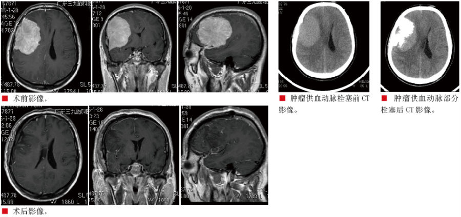 入院后查头颅MRI示:右侧额颞部大脑凸面占位性病变,考虑为脑膜瘤可能性大,待排血管周细胞瘤,大小约为7.8cm×6.3cm×5.3cm;CTA示:血供极其丰富。完善术前准备后,于2016年1月24日为其先行肿瘤供血动脉栓塞术,术中栓塞右侧脑膜中动脉其中2条分支。2016年1月25日行右侧额颞部巨大占位性病变切除术,术中完整切除肿瘤,出血200ml,未输血。肿瘤病理结果示:右侧额颞部巨大脑膜瘤(过渡型WHOⅠ级),复查MRI示:右侧额颞部原病灶已全切除。术后给予对症治疗11天后完全康复出院。
