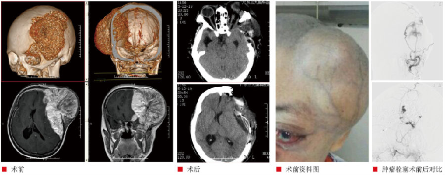 诊疗经过:头颅CTA示:1.左侧额颞顶骨占位病变,考虑良性骨肿瘤、血管瘤可能性大;2.左侧大脑镰下疝形成;向家属交代病情,于12月18日行肿瘤栓塞术,栓塞后行左侧额颞部及眶内沟通骨性肿瘤切除术,术中可见病变为骨性结构,血供丰富,骨窦丰富,边界欠清,侵犯左侧眼眶内外侧壁,部分与脑膜粘连,术中予全切除病变,术程顺利,术后予止血、预防感染、神经营养及补液等治疗。术后病理结果回报:海绵状血管瘤。