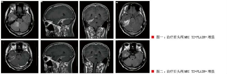 2、右侧乳突炎。给予头孢曲松钠抗感染、甘露醇减轻水肿、地塞米松消炎治疗2周。4月13日复查MRI+增强:右侧岩部、右侧海绵窦区硬脑膜及右侧小脑幕异常增厚强化,程度较前有所减轻,邻近右侧小脑半球水肿较前明显减轻、右侧颞枕叶水肿较前有减轻;右侧大脑脚软脑膜炎较前减轻(见图二)。出院后患者头痛缓解,肢体活动好。