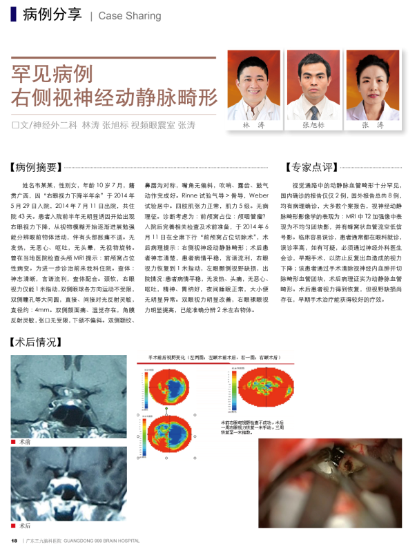 视觉通路中的动静脉血管畸形十分罕见,国内确诊的报告仅仅2例,国外报告总共8例,均有病理确诊,大多数个案报告,视神经动静脉畸形影像学的表现为:MRI中T2加强像中表现为不均匀团块影,并有蜂窝状血管流空低信号影。临床容易误诊,患者通常都在眼科就诊,误诊率高,如有可疑,必须通过神经外科医生会诊,早期手术,以防止反复出血造成的视力下降;该患者通过手术清除视神经内血肿并切除畸形血管团块,术后病理证实为动静脉血管畸形。术后患者视力得到恢复,但视野缺损尚存在,早期手术治疗能获得较好的疗效。