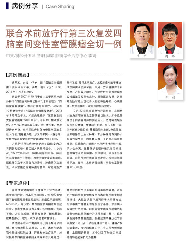 传统的手术治疗需要切开小脑下蚓部和向侧方牵拉齿状核与球状核,由此,术后可能出现小脑性缄默综合征,严重影响治疗效果。如何提高第四脑室肿瘤的全切除率以及避免这一并发症的发生仍是神经外科面临的难题。我科对一例四脑室室管膜瘤两次术后复发的案例进行探讨,大胆尝试放疗后再行手术切除方法,为术中镜下肿瘤全切除创造了条件,术后病人取得较好的疗效。四脑室室管膜瘤按肿瘤的起源部位和延伸范围分为3种类型:其中,该例病例属于四脑室底型,肿瘤起源于髓纹以下的四脑室下部(舌下和迷走神经三角),肿瘤占据四脑室后,可经四脑室正中孔突入枕大池和延髓、上颈髓的背侧,术中对舌下和迷走神经、延髓功能的保护尤为重要。