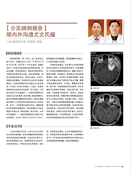 尤文氏肉瘤(Ewing’s sarcoma)又称为未分化网状细胞瘤,原发于骨髓内的原始细胞,是常见的骨的恶性肿瘤,以发生在长骨为主,发生在颅骨甚为少见,发病年龄多见于青少年,以男性略多见,早期及可发生肺转移,预后差,但放射治疗敏感。尤文氏肉瘤发病部位广泛,诊断的特异性及敏感性不高,本例患者头颅CT、MR发现左侧中颅窝颅内外沟通巨大占位性病变曾考虑脑膜瘤,最后经病理确诊。