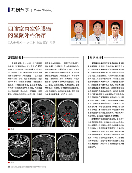 患者陈某某,女,44岁,因“走路不稳半年,加重伴恶心、呕吐2月余”2013年11月22日入院,2013年12月10日出院,共住院18天。患者于半年前无明显原因出现走路不稳,未引起重视,2个月前开始出现恶心、呕吐,到当地医院就诊,查头颅MRI提示:四脑室占位病变,性质待查;脑积水;小脑扁桃体下疝。具体治疗不详。今为进一步求手术治疗而来我院。入院时查体:神志清楚,饮水呛咳、吞咽困难,眼球震颤、闭目难立征阳性,共济失调。入院后复查头颅MRI提示:1.四脑室占位性病变:室管膜瘤?;2.脑积水;3.小脑扁桃体下疝。完善相关检查,于2013年11月25日在全麻下行四脑室内室管膜瘤切除术,术中应用神经电生理监测,术程进展顺利。术后给予脱水、预防感染、止血、营养神经、对症支持治疗,走路不稳症状较前明显好转,无恶心、呕吐,无饮水呛咳,无吞咽困难,复查MRI提示:四脑室占位性病变切除术后改变。术后病理提示:细胞型室管膜瘤,部分区域为间变型室管膜瘤,WHOⅡ-Ⅲ级。