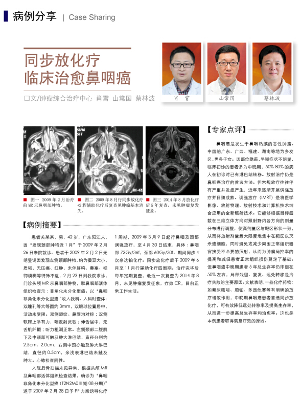 鼻咽癌是发生于鼻咽粘膜的恶性肿瘤。中国的广东、广西、福建、湖南等地为多发区,男多于女。因部位隐蔽,早期症状不明显,临床初诊的患者多为中晚期,50%-80%的病人在初诊时已有淋巴结转移。放射治疗仍是鼻咽癌治疗的首选方法。但常规放疗往往伴有严重并发症产生,近年来逐渐开展调强放疗并日臻成熟。调强放疗(IMRT)是将医学影像、放射物理、放射技术和计算机技术结合应用的全新照射技术。它能够根据目标函数在三维立体方向对照射野内各方向的剂量分布进行调整,使高剂量区与靶区形状一致,从而将放射剂量最大限度地集中在靶区以灭杀癌细胞,同时避免或减少周围正常组织器官接受不必要的照射,从而为肿瘤局控率的提高和减轻患者正常组织损伤奠定了基础。但鼻咽癌中晚期患者5年总生存率仍徘徊在50%左右,局部残留、复发、远处转移是治疗失败的主要原因。文献表明,一些化疗药物:如氟尿嘧啶、顺铂、多西他赛等有明确的放疗增敏作用,中晚期鼻咽癌患者首选同步放化疗,可有效降低远处转移率及提高生存率,从而进一步提高总生存率和治愈率。这也是本例患者取得满意疗效的原因。