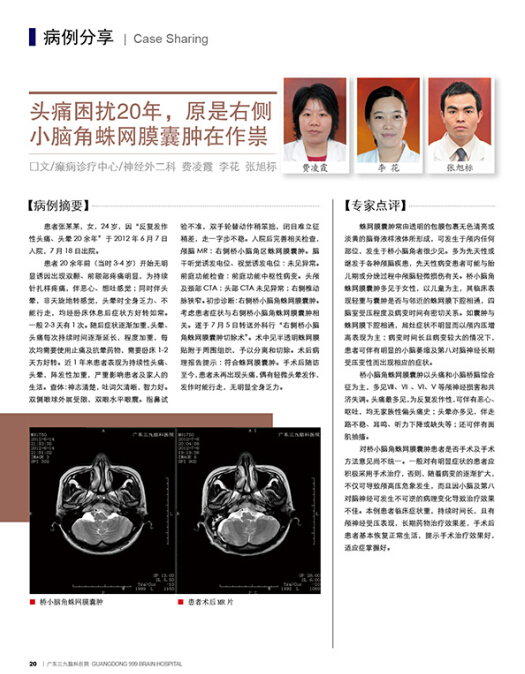患者20余年前(当时3-4岁)开始无明显诱因出现双颞、前额部疼痛明显,为持续针扎样疼痛,伴恶心、想吐感觉;同时伴头晕,非天旋地转感觉,头晕时全身乏力、不能行走,均经卧床休息后症状方好转如常。一般2-3天有1次。随后症状逐渐加重,头晕、头痛每次持续时间逐渐延长,程度加重,每次均需要使用止痛及抗晕药物,需要卧床1-2天方好转。近1年来患者表现为持续性头痛、头晕,阵发性加重,严重影响患者及家人的生活。查体:神志清楚,吐词欠清晰,智力好。双侧眼球外展受限,双眼水平眼震。指鼻试验不准,双手轮替动作稍笨拙,闭目难立征稍差,走一字步不稳。入院后完善相关检查,颅脑MR:右侧桥小脑角区蛛网膜囊肿。脑干听觉诱发电位、视觉诱发电位:未见异常。前庭功能检查:前庭功能中枢性病变。头颅及颈部CTA:头部CTA未见异常;右侧椎动脉狭窄。初步诊断:右侧桥小脑角蛛网膜囊肿。考虑患者症状与右侧桥小脑角蛛网膜囊肿相关。遂于7月5日转送外科行“右侧桥小脑角蛛网膜囊肿切除术”。术中见半透明蛛网膜贴附于周围组织,予以分离和切除。术后病理报告提示:符合蛛网膜囊肿。手术后随访至今,患者未再出现头痛,偶有轻微头晕发作,发作时能行走,无明显全身乏力。