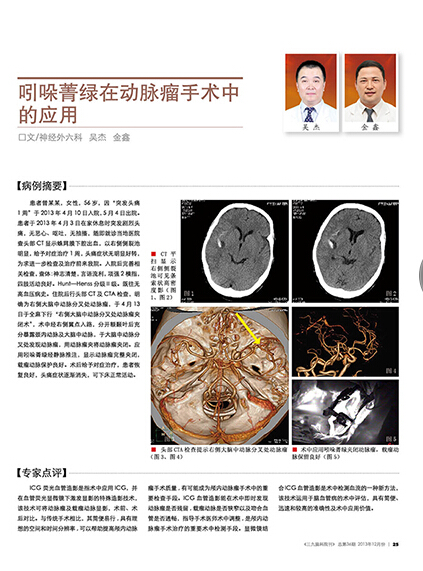 患者曾某某,女性,56岁,因“突发头痛1周”于2013年4月10日入院,5月4日出院。患者于2013年4月3日在家休息时突发剧烈头痛,无恶心、呕吐,无抽搐,随即就诊当地医院查头部CT显示蛛网膜下腔出血,以右侧侧裂池明显,给予对症治疗1周,头痛症状无明显好转,为求进一步检查及治疗前来我院。入院后完善相关检查,查体:神志清楚,言语流利,项强2横指,四肢活动良好。Hunt—Henss分级Ⅱ级。既往无高血压病史。住院后行头部CT及CTA检查,明确为右侧大脑中动脉分叉处动脉瘤,于4月13日于全麻下行“右侧大脑中动脉分叉处动脉瘤夹闭术”,术中经右侧翼点入路,分开额颞叶后充分暴露颈内动脉及大脑中动脉,于大脑中动脉分叉处发现动脉瘤,用动脉瘤夹将动脉瘤夹闭。应用吲哚菁绿经静脉推注,显示动脉瘤完整夹闭,载瘤动脉保护良好。术后给予对症治疗,患者恢复良好,头痛症状逐渐消失,可下床正常活动。