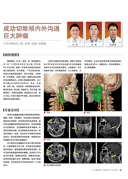 颅内外沟通瘤是指源于颅底结构如骨组织、脑膜、神经、血管组织,也可起源于颅内组织、颜面或五官组织,同时侵及颅内外结构者。颅内外沟通瘤有其独特的临床特点,如该类肿瘤生长位置深在,与周围解剖关系非常复杂。血液供应极其丰富。并且需要多学科的合作,其治疗难度大。但是,近年来由于神经外科技术的进步,特别是显微外科的发展,使得颅内外沟通瘤手术水平得以快速提升。