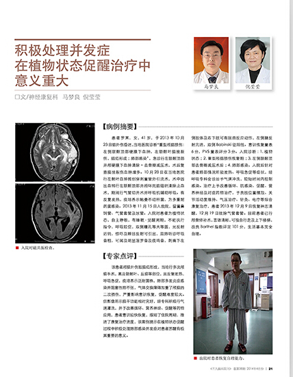 该患者颅脑外伤致脑疝形成,当地行多次颅脑手术,累及额颞叶、丘脑等部位,且反复发热,呼吸急促,痰培养示泛耐菌株,肺部多发炎症感染并阻塞性肺不张,气体交换障碍加重了颅脑的二次损伤,严重影响意识恢复,促醒难度较大。但影像所示脑干功能相对完好,经专科积极行气道灌洗,并予改善循环、营养神经、促醒等药物应用,患者意识较快恢复,缩短了住院周期,推进了康复治疗进度,该案例提示在植物状态促醒过程中积极处理肺部感染并发症对患者苏醒有极其重要的意义。