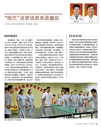 患者陈某某,男性,16岁。因“缄默不语4年余,易发脾气、懒散1年余”于2012年03月09日入院,2012年3月29日出院。患者4年前无明显诱因开始说话时吐词不清晰,话语比以前减少,不愿意与人交流。不久后,患者出现缄默不讲话,与别人交流时,通过手势或写字等方式来表达自己的想法。在课堂上,亦表现缄默不语。课余,能与同学一起玩耍。课后上网聊QQ。发病期间家人曾带其赴广州、深圳多家医院五官科作鼻咽喉镜、头部CT及MRI均正常,未作诊治。1年前,患者多次因感觉被同学嘲笑,而与同学发生矛盾后休学。曾突然离家出走1月余,期间未和任何亲人联系。1月余后,患者回家出现行为渐懒散,不愿刷牙,不愿打扫房间卫生。患者睡觉时,家人发现其能讲梦话,但次日患者仍表现缄默不语。家人为求一步诊疗带其前来我院就诊。入院查体:正常。精神检查:意识清晰,问话不答,多以点头、摇头或是笔答的方式来回应。对四周环境较警戒,不停的观察周围的动静,不愿暴露内心真实体验,意志力减退,行为显懒散,对自己的病情无认识,无自知力。诊断:癔症。