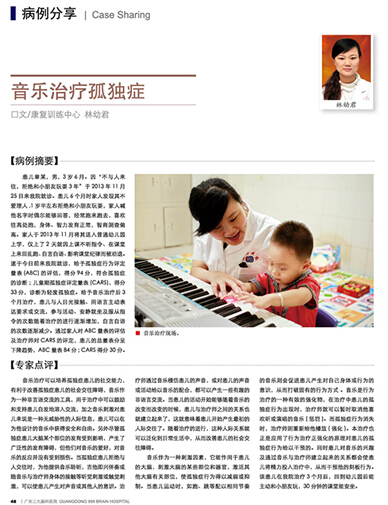 患儿章某,男,3岁6月。因“不与人来往,拒绝和小朋友玩耍3年”于2013年11月25日来我院就诊。患儿6个月时家人发现其不爱理人,1岁半左右拒绝和小朋友玩耍,家人喊他名字时偶尔能够回答,经常跑来跑去,喜欢往高处跑,身体、智力发育正常,智商测查偏高。家人于2013年11月将其送入普通幼儿园上学,仅上了2 天就因上课不听指令、在课堂上来回乱跑、自言自语、影响课堂纪律而被劝退。遂于今日前来我院就诊,给予孤独症行为评定量表(ABC)的评估,得分94分,符合孤独症的诊断;儿童期孤独症评定量表(CARS),得分33分,诊断为轻度孤独症。给予音乐治疗后3个月治疗,患儿与人目光接触、用语言主动表达要求或交流,参与活动、安静就坐及服从指令的次数随着治疗的进行逐渐增加,自言自语的次数逐渐减少。通过家人对ABC量表的评估及治疗师对CARS的评定,患儿的总量表分呈下降趋势,ABC量表84分;CARS得分30分。