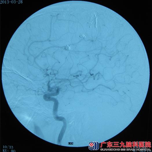 现年32岁的谭某最近在家突发头痛、右侧肢体乏力。到当地医院就诊,CT提示:左侧额顶叶脑出血并破入脑室。对症处理后头痛减轻,右侧肢体肌力好转。家属为求进一步治疗,遂转入广东三九脑科医院神经外七科(血管神经外科)。入院体查合作不理想。神志清楚,双侧瞳孔等大等圆,对光反射灵敏;左侧肌力5级,肌张力正常。右侧肌力3级,肌张力正常;左侧腱反射正常,右侧腱反射减弱,巴氏佂阴性。入院后,MRA、CTA提示动静脉畸形合并动脉瘤。完善术前其他相关检查,并与家属交待病情与风险,家属表示理解并同意介入栓塞手术。于近日行介入治疗。术中见左侧大脑前动脉额内后动脉多发动脉瘤,呈串珠样,囊状,左侧额叶动静脉畸形。外七科吾太华主任分别用弹簧圈填塞动脉瘤、外科胶栓塞动静脉畸形,术程非常顺利,术后给予抗凝血、抗感染、营养支持等治疗。术后经过两周的康复锻炼,右侧肢体肌力恢复正常出院。