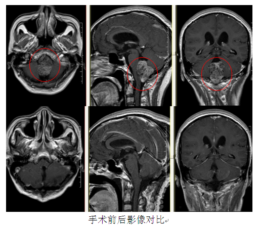 张女士因3个月前开始出现反复发作性右侧颜面部疼痛伴行走不稳,外院MR提示:右侧桥小脑角病变,考虑皮样囊肿可能性大。为求进一步治疗,来我院就诊。入院后完善相关检查、检验,在全麻下行“岩斜区肿瘤切除术”,由神经外二科林涛主任主刀,术程进展顺利。术后积极给予脱水、补液、预防感染、止血、营养神经、对症支持治疗,复查MRI提示:岩斜区肿瘤切除术后改变。术后病理提示:畸胎瘤。出院情况:目前患者神志清楚,无吞咽困难及颜面部疼痛伴行走不稳等不适。