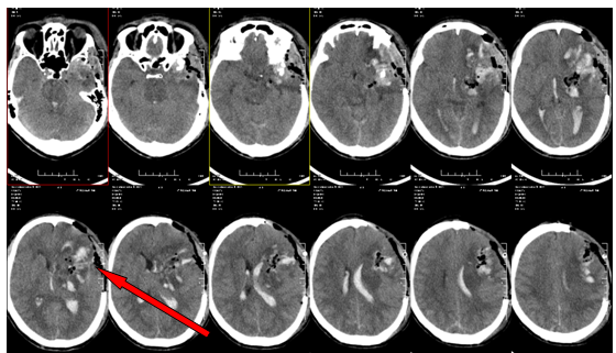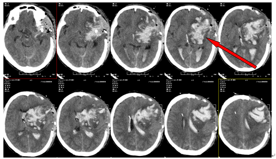 近日神经外二科成功实施急诊手术救治一钢筋贯穿大脑造成颅内大出血患者,邓男子, 58岁,不慎摔倒,被钢筋从左颞颅底部穿入颅内,约10cm深,受伤后即出现昏迷,被送到当地人民医院,行“左额颞顶脑内血肿清除+去骨瓣减压+右侧脑室外引流+颅内压探头置入术”。术后持续昏迷,复查头颅CT提示:左侧额颞顶巨大脑内血肿。为求进一步治疗,转入我院。