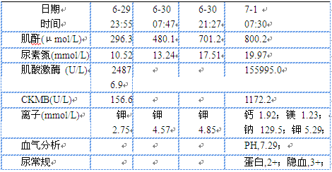 6月29日急查学回复:肌红蛋白 >3000ng/ml (28-72 )。6月29日22:50入院至6月30日 9:00:入量1500ml,仅解小便1次,量约400ml;6月30日 10:00 至7月1日 10:00入量4000ml,尿量1000ml。