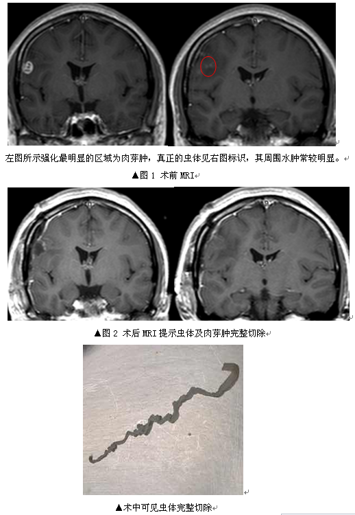 经过仔细的询问病史,结合影像学检查,发现头颅MRI显示:左侧后头部大面积软化灶,右侧额盖及中央盖得位置存在环样、片样强化,结合寄生虫学检查显示:裂头蚴抗体IgG 阳性(+) ,经过科室讨论后,患者诊断明确,决定予以实施手术,取出虫体,在术中唤醒下行右中央区病变切除术,术中取出一条长约7cm活虫,术后小潘恢复良好,顺利出院,至今再无发作。