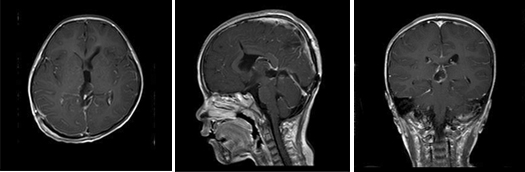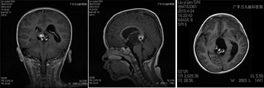 小刘在4月份的某一天上午上学时突然出现头疼,老刘赶紧带着孩子到当地医院就诊,给予对症处理,可是小刘还是感觉不舒服,结果没几天,小刘感觉头疼加重伴有呕吐,慢慢的变得意识模糊,老刘紧急送往当地儿童医院就诊,医生通过CT检查发现小刘为松果体及三脑室占位病变,梗阻性脑积水,给予脱水,降颅压,紧急行右侧侧脑室钻孔外引流术,术程顺利,术后给予相应治疗后小刘慢慢的神志清醒,头疼症状缓解,未再出现呕吐,老刘一家为了让小刘更好得康复,于是转院到广东三九脑科医院神经外七科进行治疗,神经外七科吾太华主任在详细了解小刘情况后,根据复查颅脑CT提示松果体及三脑室内占位病变,脑积水脑室外引流术后改变,遂以“松果体及三脑室占位,梗阻性脑积水”收治入院,入院后完善相关检查,进一步明确诊断,颅脑MR检查提示为松果体及三脑室内占位病变,考虑生殖性肿瘤,以成熟型畸胎瘤可能性大,幕上梗阻性脑积水脑室外引流术后改变,经积极术前准备,小刘在全麻下性松果体及三脑室内占位病变切除术,术程顺利,术后病理为松果体及三脑室不成熟畸胎瘤 WHO I级,复查颅脑MR提示原病变已切除,颅脑CT提示脑积水已缓解。