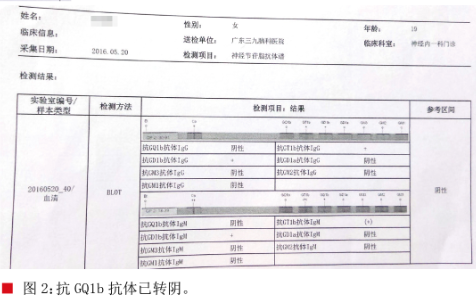 2016年1月患者再次出现头晕,伴频繁呕吐,并出现行走不稳,发作性视物重影、视物不清,声音嘶哑,间断性耳鸣、听力下降,伴一过性意识丧失1次,于当地医院治疗无好转就诊我院,入院查体:患者神志清楚,语言流利,声音嘶哑。双侧眼球活动自如,双眼无震颤。左侧瞳孔圆形,直径约5mm,对光反射迟钝;右侧瞳孔椭圆形,直径约2.5mm,对光反射灵敏。双耳听力粗测正常。双侧鼻唇沟对称,伸舌无偏斜。四肢肌张力正常,肌力5级。双侧指鼻、轮替试验正常,左侧跟膝胫试验欠准稳,全身感觉系统检查未见异常。四肢腱反射减弱,双侧病理征可疑阳性。入院后行颅脑MRI+增强检查未见异常;肌电图提示周围神经损害;诱发电位示左侧异常视诱发电位;瞬目反射异常;血清抗神经节苷脂抗体检查示抗GQ1b IgG(+)。脑脊液常规检查,其他血液化验均未见异常。诊断为Bickerstaff脑干脑炎。予丙种球蛋白20g冲击治疗3天,甲强龙120mg静滴5天,患者头晕、呕吐症状逐渐减轻,行走不稳、声音嘶哑明显好转,未再有视物重影,无耳鸣、听力下降。改为小剂量甲泼尼龙口服维持治疗并出院。1月后回院复诊,患者病情稳定改善,复查血清抗GQ1b IgG(-)。