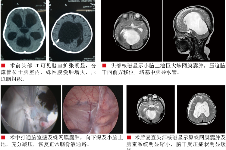 患儿8个月时仍不能抬头、翻身等,就诊外院行头部CT显示小脑上池蛛网膜囊肿合并脑积水,行脑室腹腔引流术,术后1个月复查头部CT显示脑室缩小,但原蛛网膜囊肿继续增大,压迫脑干。入院查体:患儿神志清,不会言语,双瞳等大等圆,直径3.0mm,对光反射灵敏,颈部无力,不能站立。