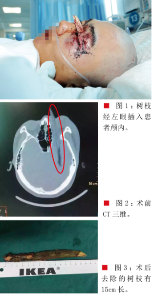 患者于2月4日21时许不慎摔倒,致使木条插入左眼部,伤后流血不止,伴有烦躁不安,家人立即将其送入当地医院救治。查头颅CT提示:左眶至左颞区条状异物插入并左颞部脑挫裂伤、少量蛛网膜下腔出血及颅内积气,左眶尖粉碎性骨折伴左眼球轻度变形并向前外侧突出、左侧内直肌肿胀、上下直肌显示不清,左眼睑及左颌面部软组织肿胀,左筛窦及上颌窦积血。予对症处理后患者病情无明显改善,为进一步治疗转入我院,急诊拟“重型开放性颅脑损伤”收住院。入院查体:患者呈浅昏迷状态,刺痛睁眼,言语错乱,刺痛定位,GCS评分10分。烦躁不安,查体不合作,左眼内眦处可见木条残端,左眼周淤青肿胀明显,左眼结膜充血明显,左侧瞳孔直径约4mm,直接间接对光反射消失,右侧瞳孔直径约2.5mm,对光反射存在,颈软。四肢肌力、肌张力检查不配合,双侧生理反射检查不配合,双侧病理征阳性。头颅CTA:异物临近颈内动脉大血管。急诊完善术前相关检查,同时请珠江医院眼科教授会诊,拟急诊行“左侧眼眶及颅内异物取出+左颞叶血肿及坏死脑组织清除+左额极部分切除+颅底重建+去骨瓣减压+气管切开术”,术中暴露右眼异物植入区,铣刀形成大小约12cm×13cm骨瓣,切开颞部硬膜,切除部分坏死脑组织、清除颅内血肿,颅内压力仍较高,并切开额部硬膜,切除部分额极脑组织,见颅内树枝异物,继续清除树枝周围坏死脑组织,完整暴露颅内树枝,右侧眼眶后壁粉碎性骨折,予清除碎骨片,眼球保护完好,反复清洗术腔,磨钻从眼眶后壁磨断树枝,先取出颅内段树枝,再从外侧拔除眼眶内树枝,过程顺利,未见活动性出血,反复清洗眶内及颅内,眶后破裂硬膜,分别严密修补内外侧,分离部分颞肌,以活肌瓣填充颞窝,手术顺利结束。术后予脱水降颅压、止血、抗感染、预防癫痫、营养神经、改善循环、制酸护胃、维持内环境稳定、对症及支持治疗。经专科治疗护理,患者神志清楚,骨窗皮瓣张力正常,双侧瞳孔不等大,左侧直径约7.0mm,对光反射消失,右侧直径约2.5mm,光反射灵敏;颈软无抵抗;四肢肌力、肌张力正常,活动良好,康复出院。