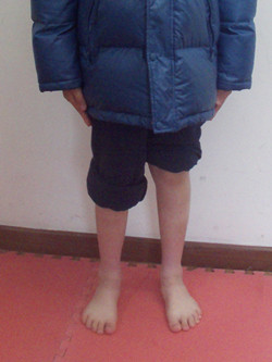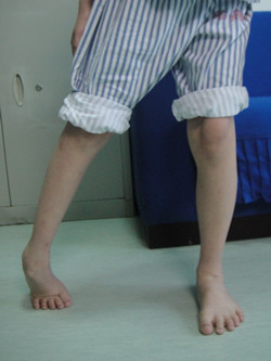 到了1岁该学走路的时候,爸爸发现小贾的双下肢无力,双足下垂,怎么都学不会自己站立,更别说走路了。2岁时,小贾开始在当地医院接受康复治疗,配穿矫形鞋,可放平双足,并逐步学会了站立和慢步行走。4岁时,因矫形鞋过小,于是小贾就没有再配穿矫正鞋,而是在家自行训练。