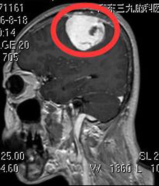 转入广东三九脑科医院综合神经外科,进一步行头颅MR检查结果:左侧顶部占位病变,范围约61.6mm×41mm×45.5mm;头颅CTA检查提示:左侧顶部占位病灶(含出血,肿瘤卒中可能性大)。结合CTA检查其内肿瘤供血血管丰富,周围包绕供血动脉,脑膜动脉来源可能性大,首先考虑脑膜瘤或血管外皮瘤可能。