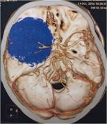 经查体,神经外六科吴杰主任诊断为:左侧蝶骨嵴占位性病变,考虑脑膜瘤可能性大。之后黄女士完善了相关检查,颅脑CT及CTA检查提示:左侧中颅窝底巨大占位病变,其内血管丰富,临近左侧大脑中动脉明显受压向上移位,考虑脑膜瘤;颅脑磁共振提示:左侧前中颅窝底巨大占位性病变,考虑脑膜瘤。介入栓塞提示:肿瘤主要由左侧脑膜中动脉额支、少量由左侧眼动脉脑膜支参与供血。