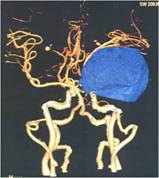 颅脑CT及CTA检查可见左侧额颞稍高密度占位,肿瘤血供丰富