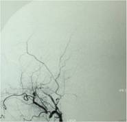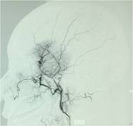 DSA显示栓塞前肿瘤主要由左侧脑膜中动脉额支供血,栓塞后肿瘤血供明显减少