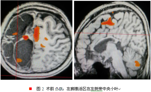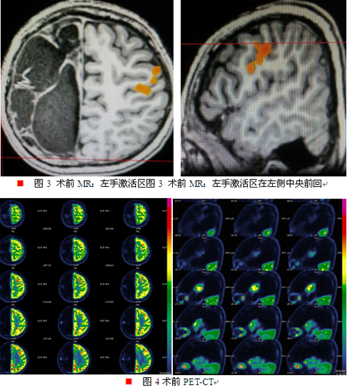 辅助检查:MR薄层扫描检查提示:1.右侧大脑半球及左侧额叶多发软化灶形成,并胶质增生、囊性脑萎缩;2.胼胝体发育不良;3.右侧内囊后肢、丘脑及大脑脚异常改变,考虑沃勒变性(如图一所示)。视频脑电图:异常脑电图III,间歇期:1.右半球半球生理节律减弱;2.癫痫样放电,①弥漫性,②右半球。发作期:BATS→过度运动,脑电图提示中线区著。fMRI:活动左侧肢体,右侧半球中央区未见激活,左侧半球SMA、中央前后回可见激活(如图二、三所示)。PET:右侧半球残存组织低代谢,左侧颞极及颞叶内侧结构低代谢(如图四所示)。IQ/MQ:全量表46,言语55,操作41,韦氏记忆<51。视野检查不配合。wada试验提示左侧为语言优势半球,左侧肢体运动功能已代偿转移到左侧大脑半球。