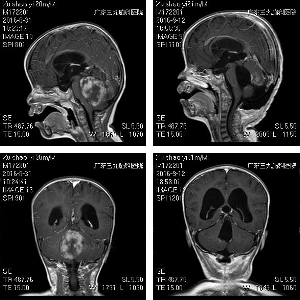 小孩家属10天前突然发现自家小孩1岁8月仍不能独立行走在当地儿童医院就诊,行颅脑磁共振平扫检查发现四脑室内占位病变,并梗阻性脑积水,建议小孩家属进一步完善检查,并手术治疗。患儿家属经协商后决定来广州治疗,近日来广东三九脑科医院神经外七科就诊,门诊行颅脑磁共振检查提示四脑室占位病变,梗阻性脑积水,遂以“四脑室占位病变,梗阻性脑积水”收治入科。入院专科检查:神志清,精神可,可简单对答,双侧瞳孔等大等圆,直径3.0mm,光反应灵敏,眼球运动无异常,视力视野查体不配合,粗测正常,口角无歪斜,颈软,四肢肌力、肌张力未见异常,双侧膝、跟腱反射未见异常,双侧Babinski征阴性,不能独立行走,需搀扶下可勉强行走,可扶固定物体站立,缓慢行走。