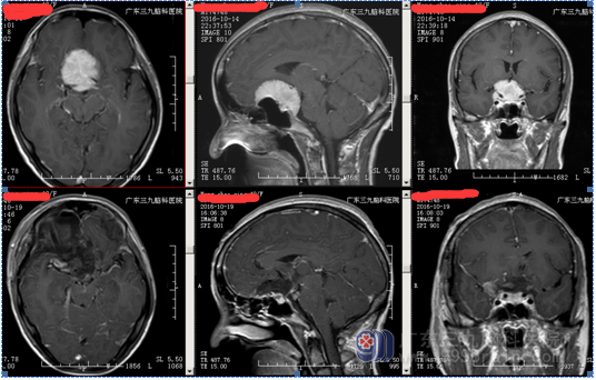 王女士,40岁, 5年前开始出现右眼视物模糊,1年前开始出现左眼视物模糊,为求治疗,来我院就诊。病人由神经外一科接诊,完善相关术前检查,结果示:肿瘤组织包绕神经、动脉,考虑到手术的风险性,科室组织专家反复进行术前讨论,拿出最佳的手术方案,由神经外一科主任张良主刀完成。