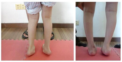 颜颜6岁时,曾在当地残联特殊学校康复训练及学习,现在能说话、双手持物也灵活,但行走时呈现膝外翻和踝关节外翻畸形,站立不稳,需要助行器帮助才能缓慢行走。