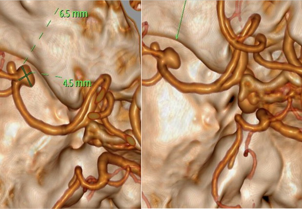 入院后,解先生完善了CT检查,影像可见蛛网膜下腔出血,以左侧外侧裂区域较为明显;左侧大脑中动脉M1段分叉处外缘及下缘各有一囊状凸起动脉瘤影,形态不规则,约6.5 mm×4.5 mm;DSA显示动脉瘤呈分叶状。