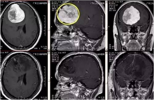 李女士,48岁,3年前开始出现间断头痛,能自行缓解,近20天头痛加重无法忍受,遂来我院门诊就诊,CT提示右侧额部类圆形稍低密度影,入院后完善检查,MR示右侧额部镰窦旁旁巨大脑膜瘤,病灶大小约7.0cm*5.9cm*6.4cm,CTA提示肿瘤周围血管包绕,血供丰富。患者手术由神经外一科主任张良主刀完成,行全麻下右侧额部镰窦旁巨大脑膜瘤切除术,术后患者症状消失,目前恢复良好出院。