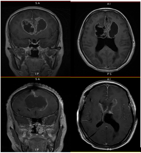 入院后颅脑MRI提示:双侧额叶跨胼胝体占位性病变,考虑胶质母细胞瘤可能性大,合并双侧侧脑室梗阻性脑积水。转神经外二科治疗,复查头颅CT提示脑积水较前略加重,考虑到患者颅高压症状较明显,肿瘤压迫及脑积水加重所致,不排除颅压进一步增高导致患者昏迷甚至呼吸停止可能,遂急诊行脑室外引流术,术后给予综合观察治疗,为手术切除完善术前准备。同期,行全麻下双侧额叶及胼胝体高级别胶质肿瘤切除术+ICP探头植入术,手术由神经外二科主任林涛主刀完成,切除肿瘤大小约:6.0*5.5*4.0cm,双侧大脑前动脉保护良好。术后查体:神清,对光反射灵敏,心肺腹未见异常,肌张力正常。考虑恶性较高胶质瘤,故后续仍需放化疗治疗。