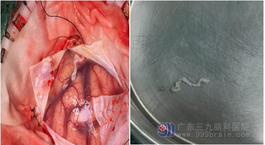 神经外二科林涛主任和张旭标医生对该患者在外院核磁共振的影像进行分析,高度怀疑是颅内寄生虫感染。随后,学科为该患者制定了详细的手术方案。手术由神经外二科主任林涛主刀完成,在全程术中导航和电生理监测下为患者实施行了寄生虫取出术,术中在左侧额叶发现一条长约9厘米的白色裂头蚴,虫体是术中还在不断活动,完整取出虫体后,电生理提示脑功能保护完好。目前患者康复良好出院。
