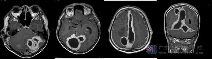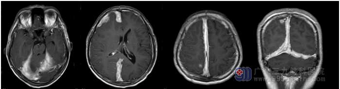 入院后查头颅MR提示:1.大脑镰右侧,小脑幕两侧、右侧额部及右枕部幕下多发硬膜外脓肿形成,右侧顶叶多发脑脓肿,考虑来源于右侧中耳乳突炎所致可能;2.右侧大脑镰下疝合并小脑扁桃体下疝形成;3.垂体变薄,考虑与颅内高压有关可能。