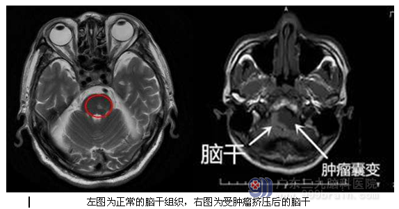 广东三九脑科医院神经外一科主任张良医师介绍:三叉神经鞘瘤为起源于三叉神经根、半月节或三周围支的脑外良性肿瘤,占颅内原发肿瘤的 0.2%。 影像学检查,特别是MRI无颅骨伪影和 具有多维成像特点,除清晰显示肿瘤本身特征外,还能了解病变范围及与周围组织的关系,是三叉神经鞘瘤诊断、鉴别诊断和辅助手术治疗的重要检查方法。本例患者MR清楚显示肿瘤的大小,形态等。尤其下极肿瘤囊变压迫脑干,脑干变得很薄,术中轻微牵拉肿瘤导致心率下降,甚至心跳停止,手术中心跳停止6秒,多次心跳低于40次/分,然后会恢复。