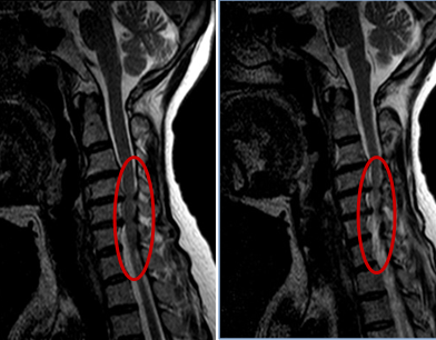 入院后完善各项辅助检查,赖奶奶的颈椎DR显示: 颈椎生理曲度变直;各颈椎椎体骨质完整,C3-6椎体边缘见骨质增生,C3/4、4/5、5/6椎间隙稍变窄,双侧C3/4、4/5、5/6椎间孔变窄;齿状突居中。颈椎MR示:1.颈椎退行性变,椎体欠稳;2.颈3/4、颈4/5、颈5/6椎间盘向后突出;颈4/5水平椎管狭窄,局部颈髓受压变性。