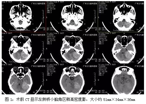 李女士,女性,42岁,3年前出现耳鸣未引起重视,近期外院就诊,CT显示桥小脑角占位性病变,为求进一步治疗,来我院就诊。入院后完善相关检查,术前CT显示左侧桥小脑角区稍高密度影,大小约51mm×34mm×36mm,术前CTA显示肿瘤位置、血供丰富,磁共振检查结果提示左侧后颅窝占位性病变,完善术前准备后,于全麻下行左侧CPA区脑膜瘤切除术,手术由神经外一科主任张良主刀完成,手术过程顺利,术后磁共振提示肿瘤切除。