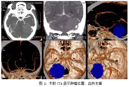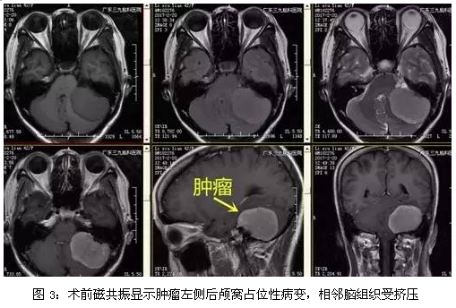 广东三九脑科医院神经外一科主任张良介绍:桥小脑角区脑膜瘤 ( cerebellopontine angle,CPA) 是此区仅次于听神经鞘瘤的最常见的肿瘤,因其位置深在,术野狭窄,邻近后组颅神经、脑干和重要的血管,故手术对肿瘤进行彻底切除难度及手术危险性较大,致残率高。CPA脑膜瘤临床表现主要取于肿瘤与三叉神经、 面听神经、后组脑神经及桥小脑的关系,其中以听神经损害最为常见,54.5%的患者出现听力下降或耳呜,三叉神经损伤亦较为常见,占全部病例的30.3%。本例患者首发症状亦为听神经损伤所致的耳鸣症状。