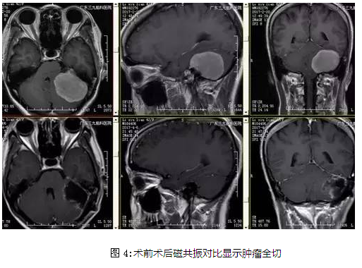 CPA脑膜瘤由于其病程长,肿瘤生长缓慢,早期症状隐匿,当产生明显症状时,体积已很大,本例亦为巨大肿瘤,手术完全切除肿瘤并尽可能保留周围神经及重要血管仍具有挑战性,本例术后复查MR提示肿瘤全切,患者恢复良好。
