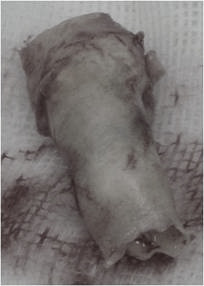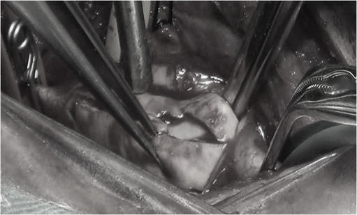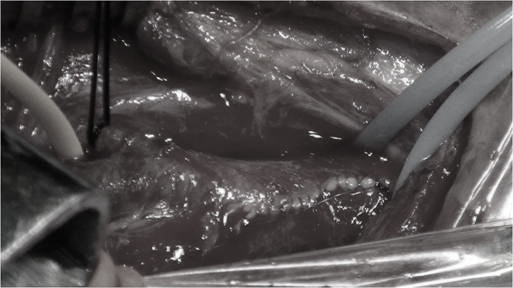 几天后,由吴杰主任主刀,在全麻下为潘叔实施右侧颈内动脉内膜剥脱术。手术在神经电生理、经颅多普勒超声(TCD)监测下进行,术中可见右侧颈内动脉起始部斑块形成,管腔明显狭窄(如图五);术中对迷走神经、舌下神经等重要结构保护良好,手术过程顺利。