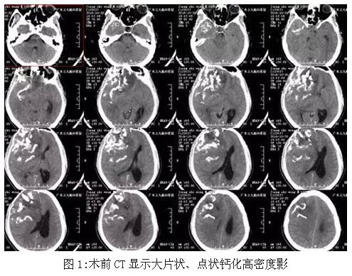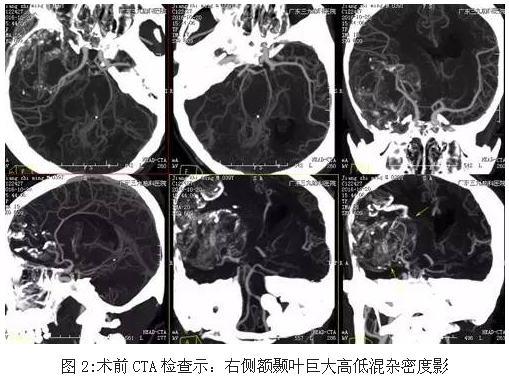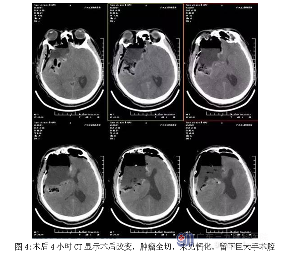 患者江某某,男性,39岁,发热后头部胀痛,当地医院就诊,CT显示:颅内巨大占位性病变,为求有效治疗,来我院就诊。入院后完善术前相关检查,术前CT显示大片状、点状钙化高密度影,术前CTA检查示:右侧额颞叶巨大高低混杂密度影,术前磁共振显示肿瘤位置及大小约10.8×8.6×8.7cm,完善术前准备后,行全麻下右侧额颞岛叶-基底节肿瘤切除术,手术由神经外一科主任张良主刀完成,术中肿瘤全切,术后恢复良好。